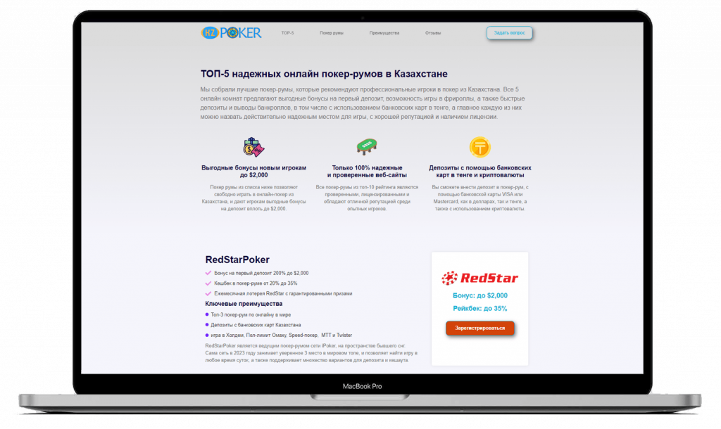 Мы собрали лучшие покер-румы, которые рекомендуют профессиональные игроки в покер из Казахстана. Все 5 онлайн комнат предлагают выгодные бонусы на первый депозит, возможность игры в фрироллы, а также быстрые депозиты и выводы банкроллов, в том числе с использованием банковских карт в тенге, а главное каждую из них можно назвать действительно надежным местом для игры, с хорошей репутацией и наличием лицензии.
